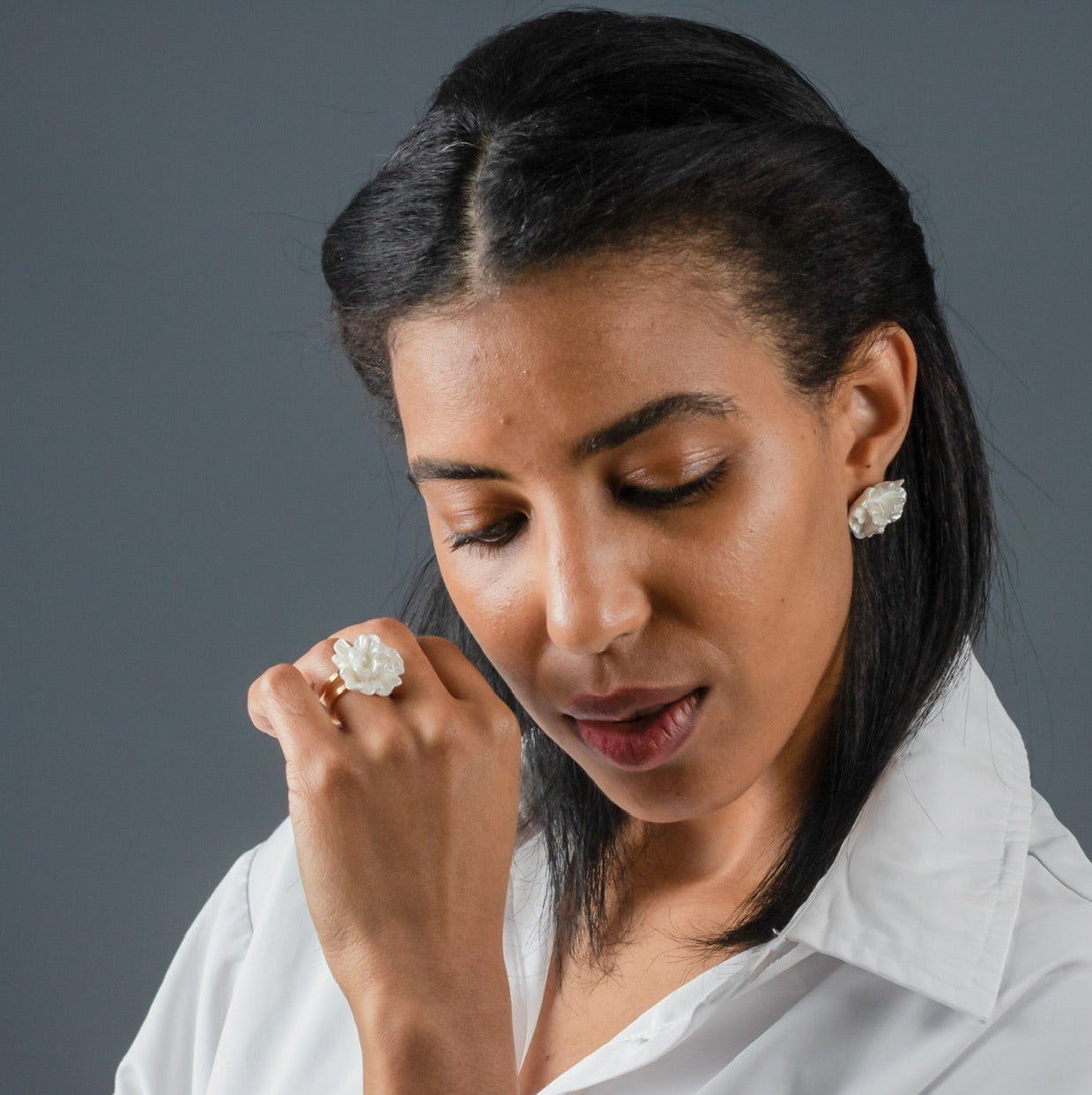 Ya sea para una tarde soleada o una noche cálida, nuestros anillos y pendientes Flora son la elección perfecta para brillar con luz propia y celebrar cada instante.