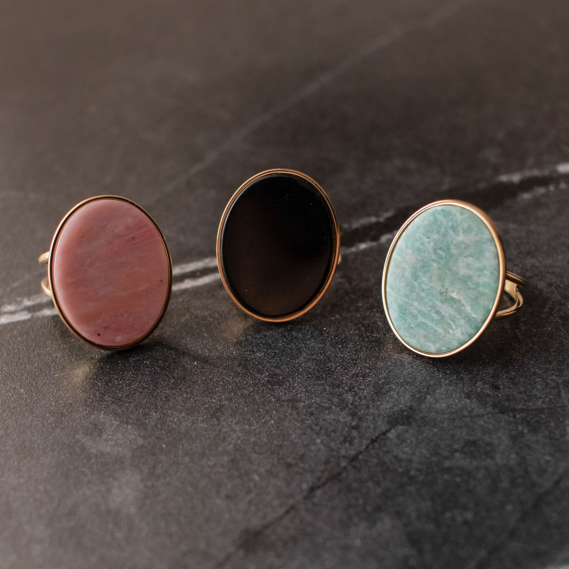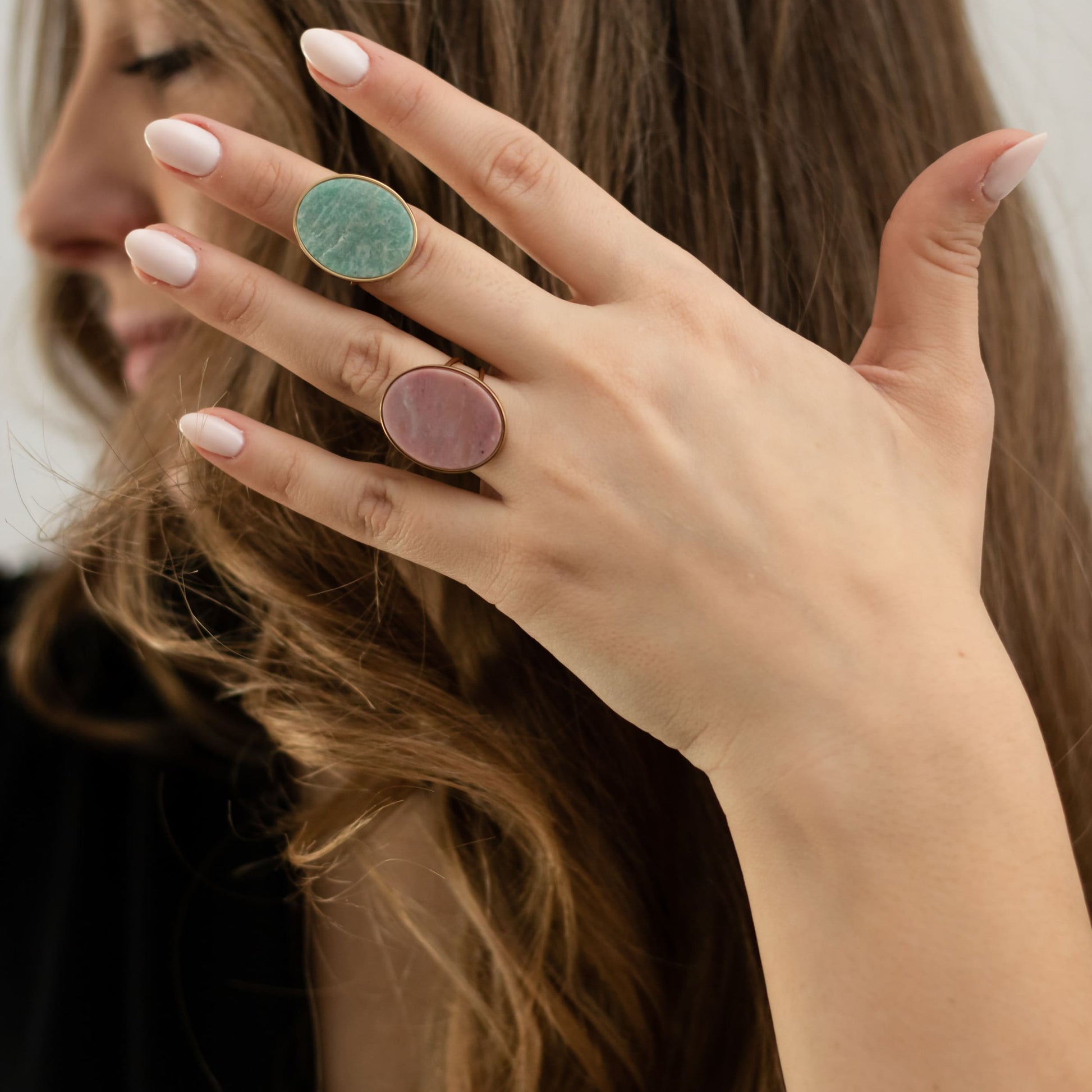 En el centro, una piedra natural se convierte en la auténtica protagonista de la pieza. Disponible en verde turquesa, rosa palo o negro, cada color transmite una emoción distinta: frescura y energía, dulzura y calma, o fuerza y elegancia. Cada piedra es única, lo que hace que cada anillo lo sea también.