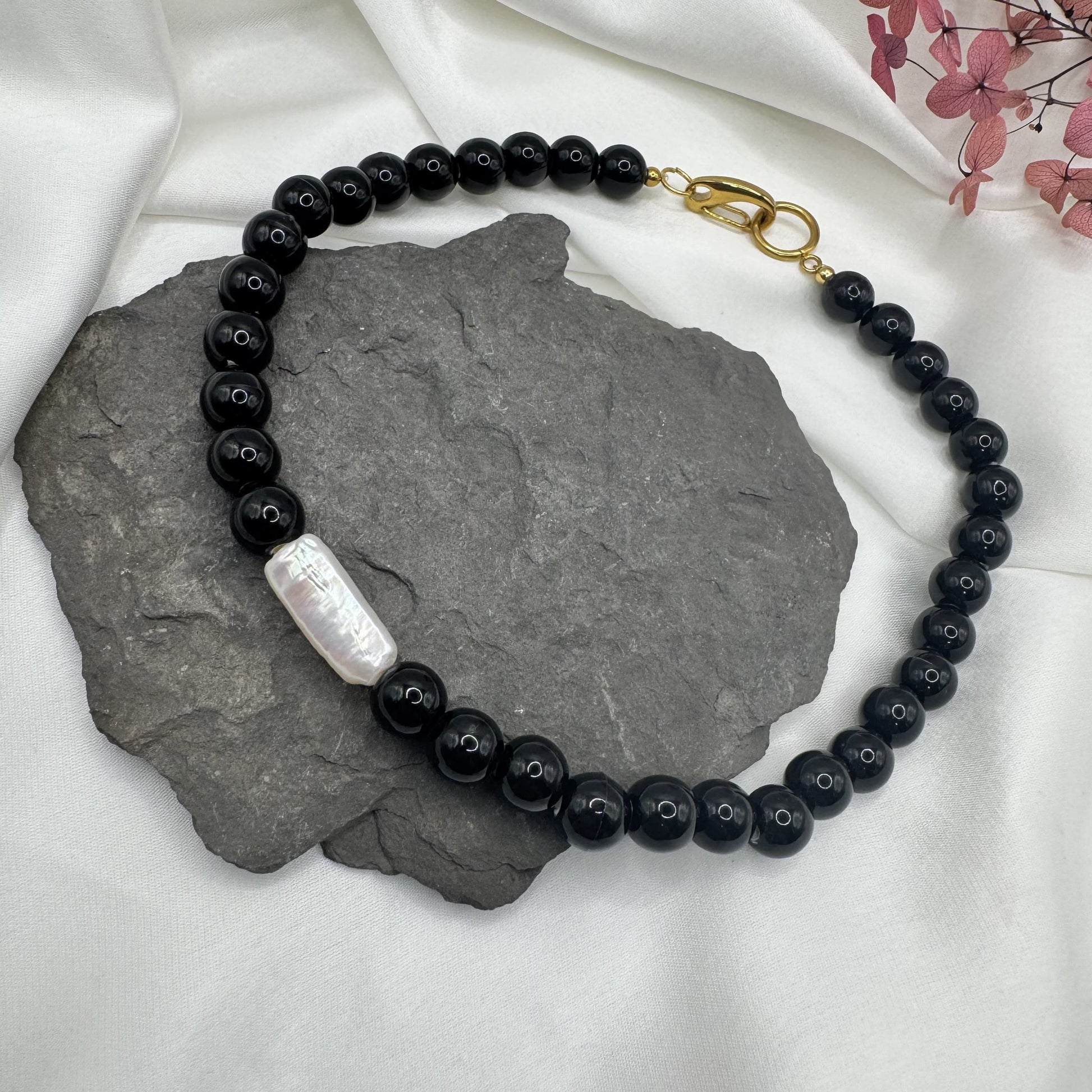Un collar que parece susurrado por las manos que lo crearon: cerámica pintada a mano, perla barroca de agua dulce y un broche de acero con baño en oro de 18k que convierte cada uso en un ritual de elegancia. Llévalo delante o detrás, como más te guste. Además, el collar es elástico, para que la comodidad, sea tu aliada.