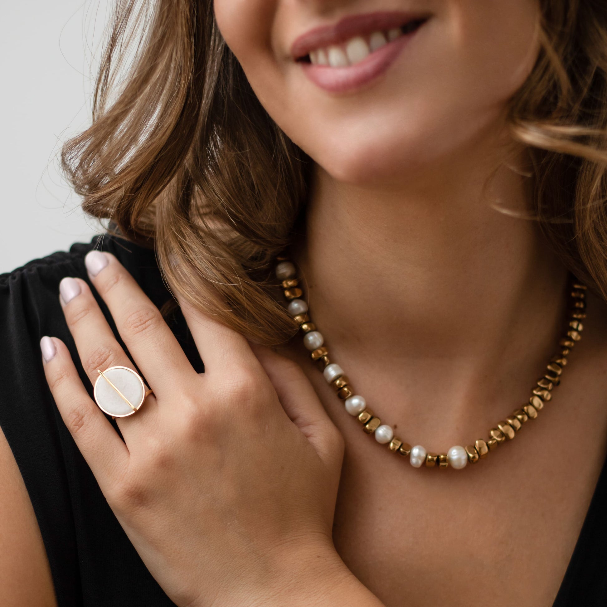 Cada perla aporta su textura y brillo único, mientras las piezas doradas labradas añaden un toque de carácter y luminosidad que realza el escote con naturalidad. Su diseño versátil permite llevarlo tanto en ocasiones especiales como en el día a día, elevando cualquier look con un gesto sencillo pero lleno de fuerza.