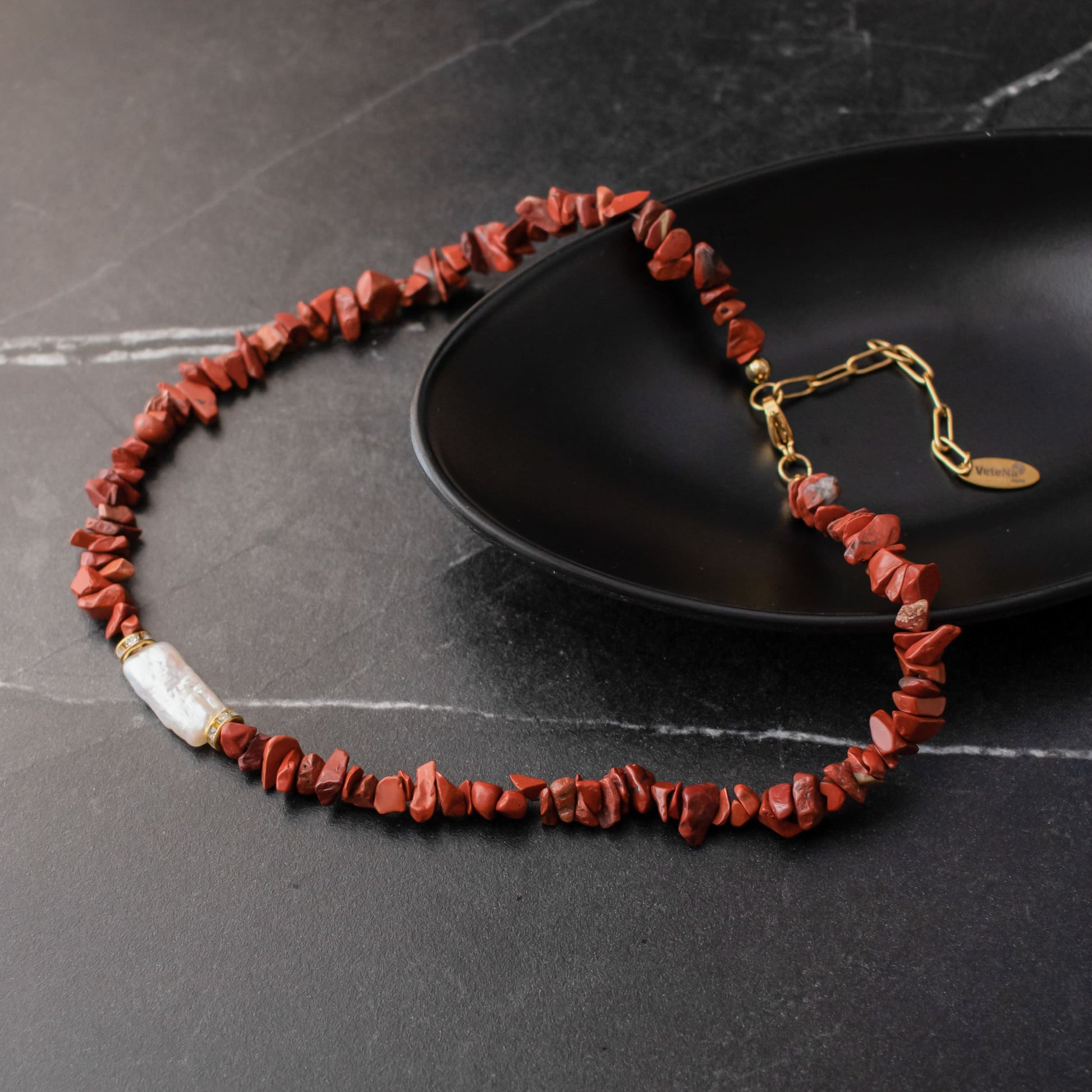 El Collar Fuego de Luna está elaborado de forma artesanal con jaspe rojo, una piedra profundamente vinculada con la energía vital, el coraje y la capacidad de mantener el equilibrio incluso en los momentos más exigentes. Se dice que aporta fuerza interior, claridad y una estabilidad emocional que acompaña y sostiene a quien la lleva.