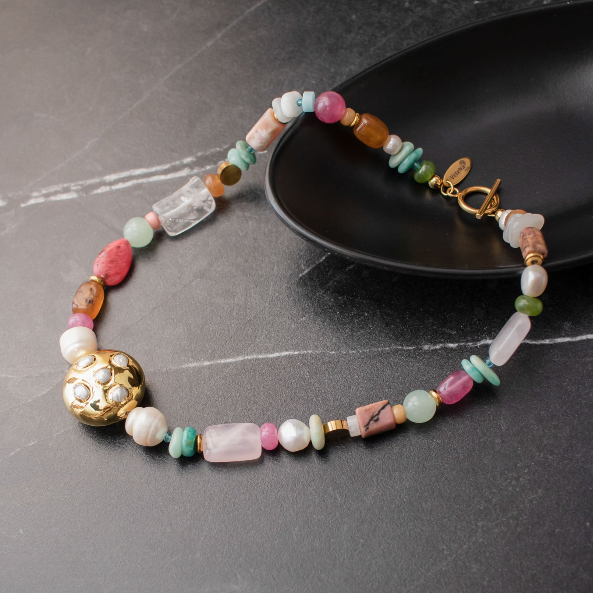 El cierre tipo OT chapado en oro asegura comodidad, estilo y durabilidad, además de facilitar su colocación. Es una joya perfecta tanto para elevar un look diario como para completar estilismos más especiales, aportando color, luz y un toque artístico inconfundible. Al estar realizada en pequeñas producciones y de manera artesanal, cada collar es exclusivo y no hay dos exactamente iguales.