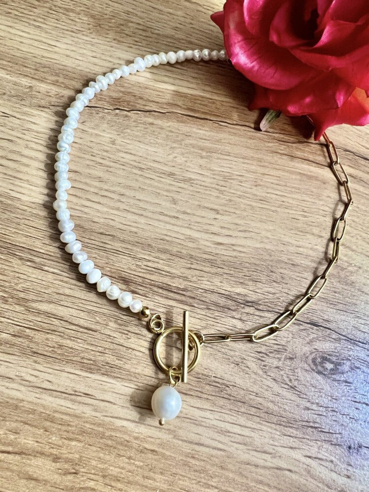 Una joya que une lo clásico y lo contemporáneo con equilibrio perfecto. Nuestro Collar Perla está hecho a mano combinando la delicadeza de las perlas de agua dulce con el brillo moderno de una cadena de acero inoxidable, creando una pieza sofisticada, versátil y con mucho estilo.