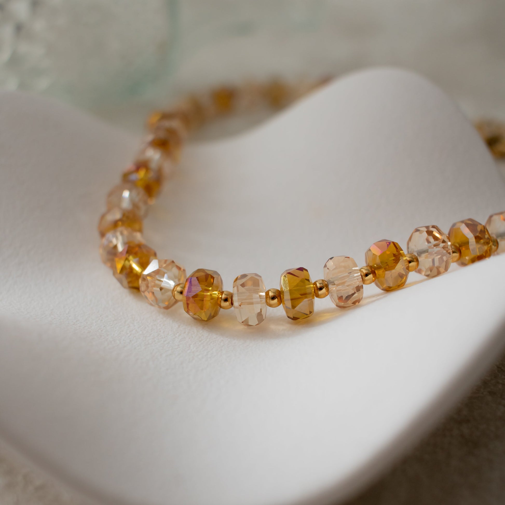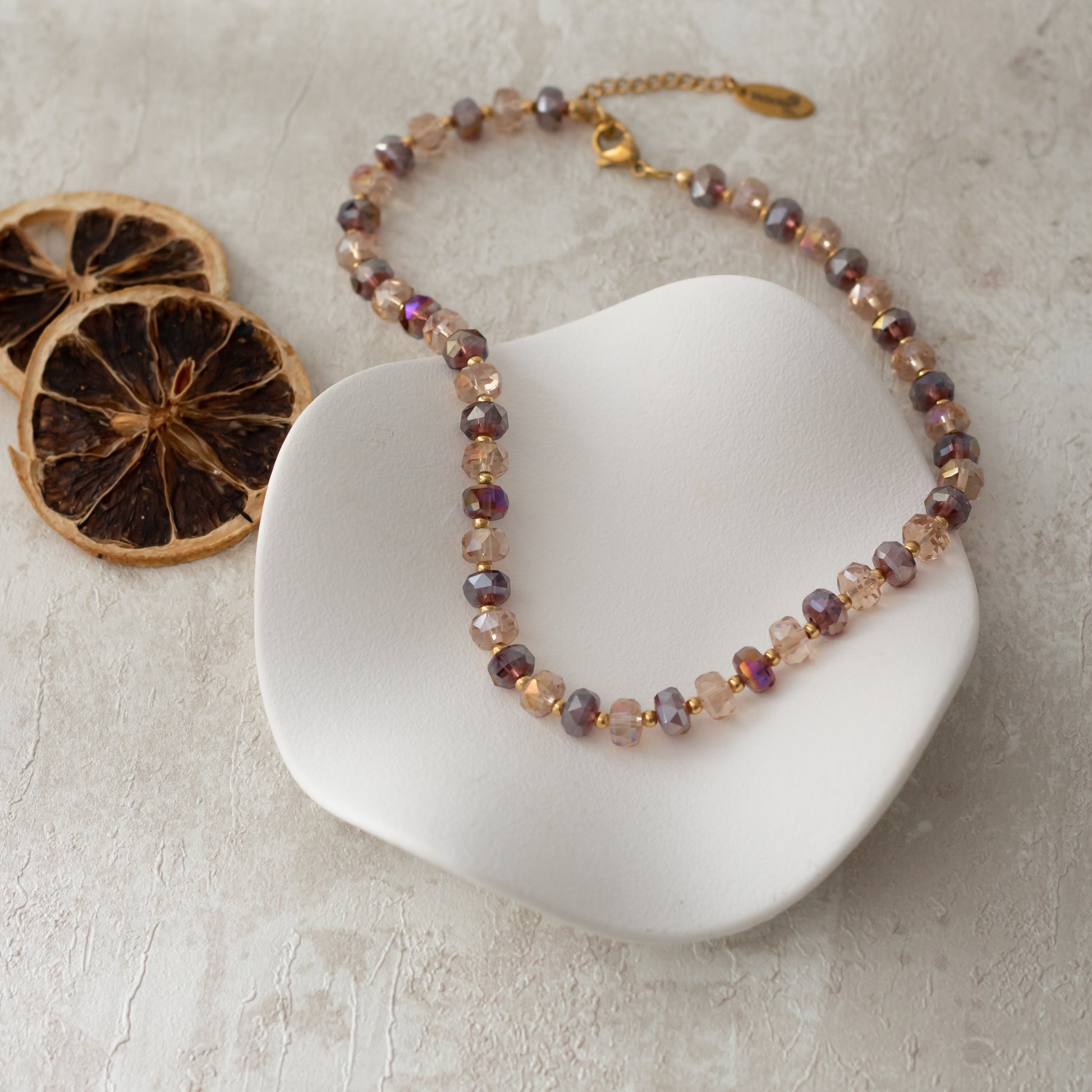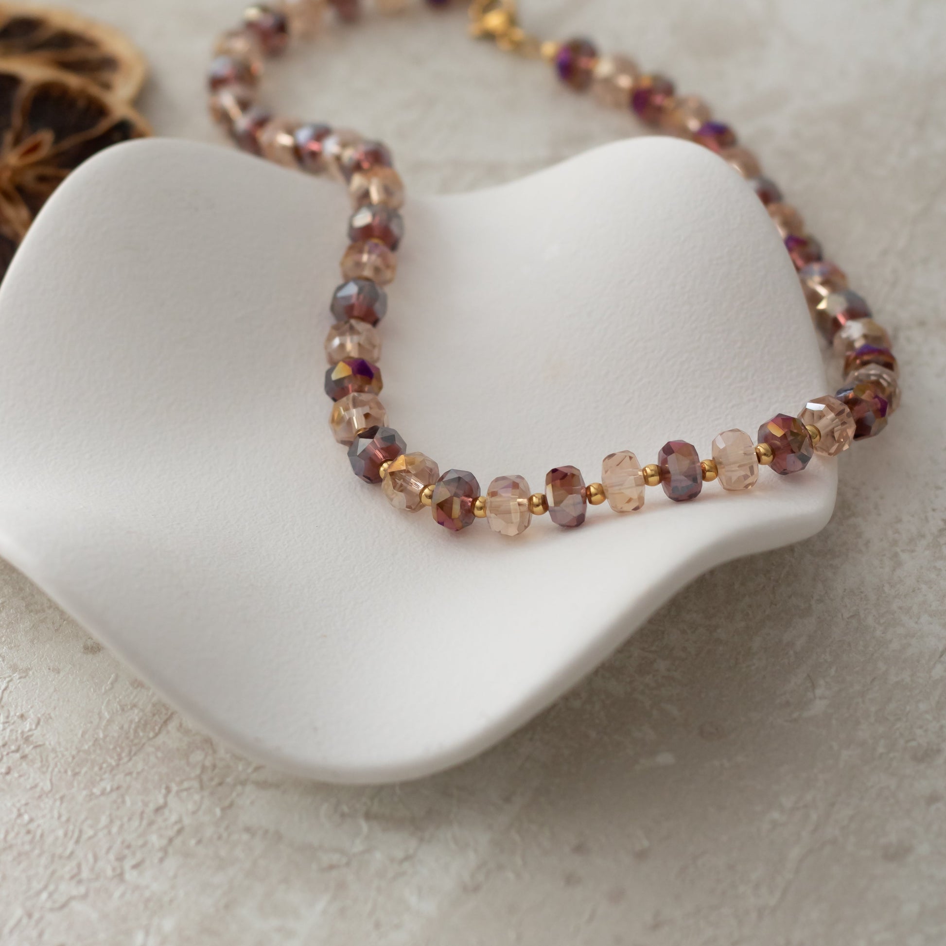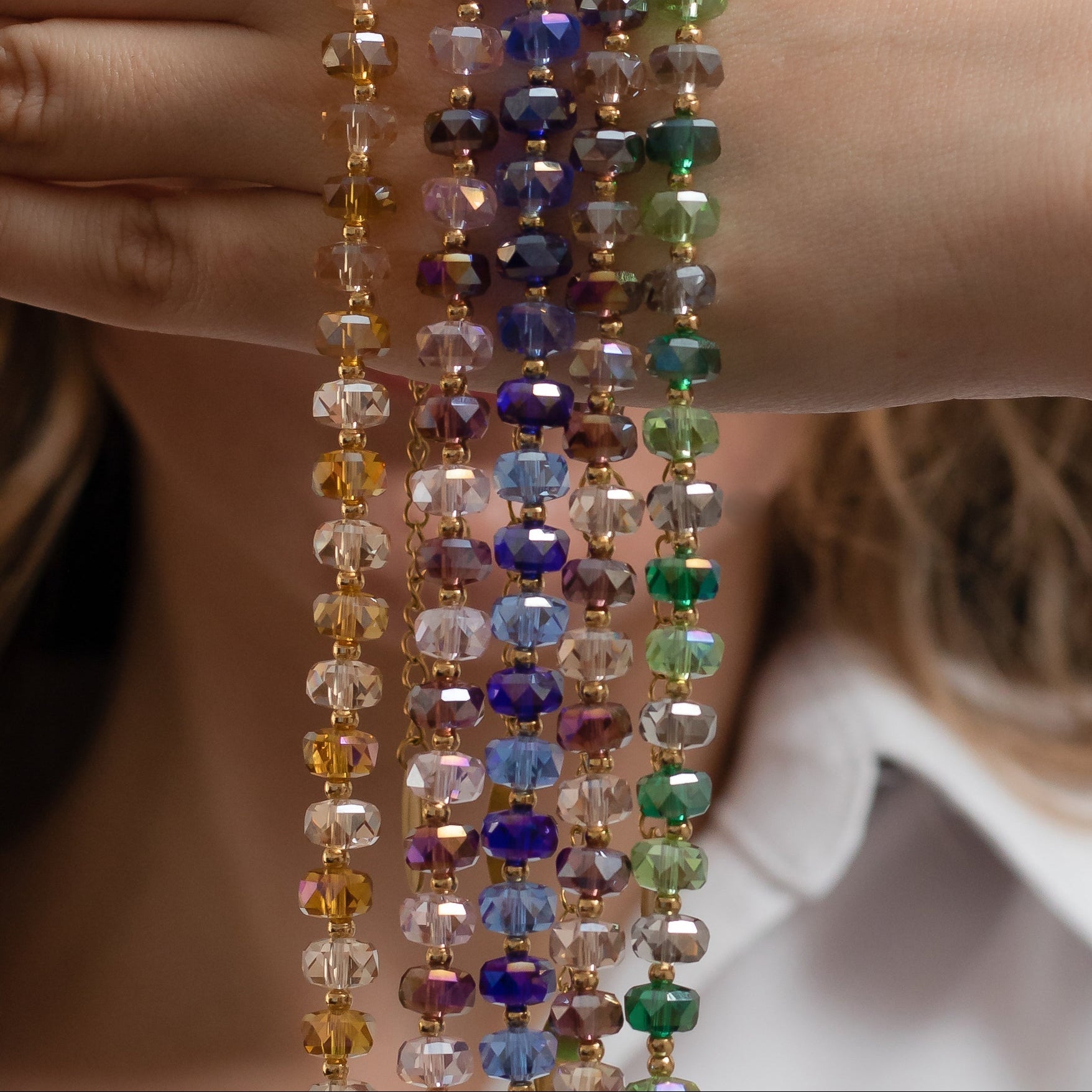 Creada íntegramente con cristales tornasolados, cada uno de sus matices refleja la luz de forma distinta, generando un efecto único en cada movimiento. No hay un solo tono, no hay un solo brillo… hay profundidad, matices y una sensación constante de luz viva que acompaña tu gesto.