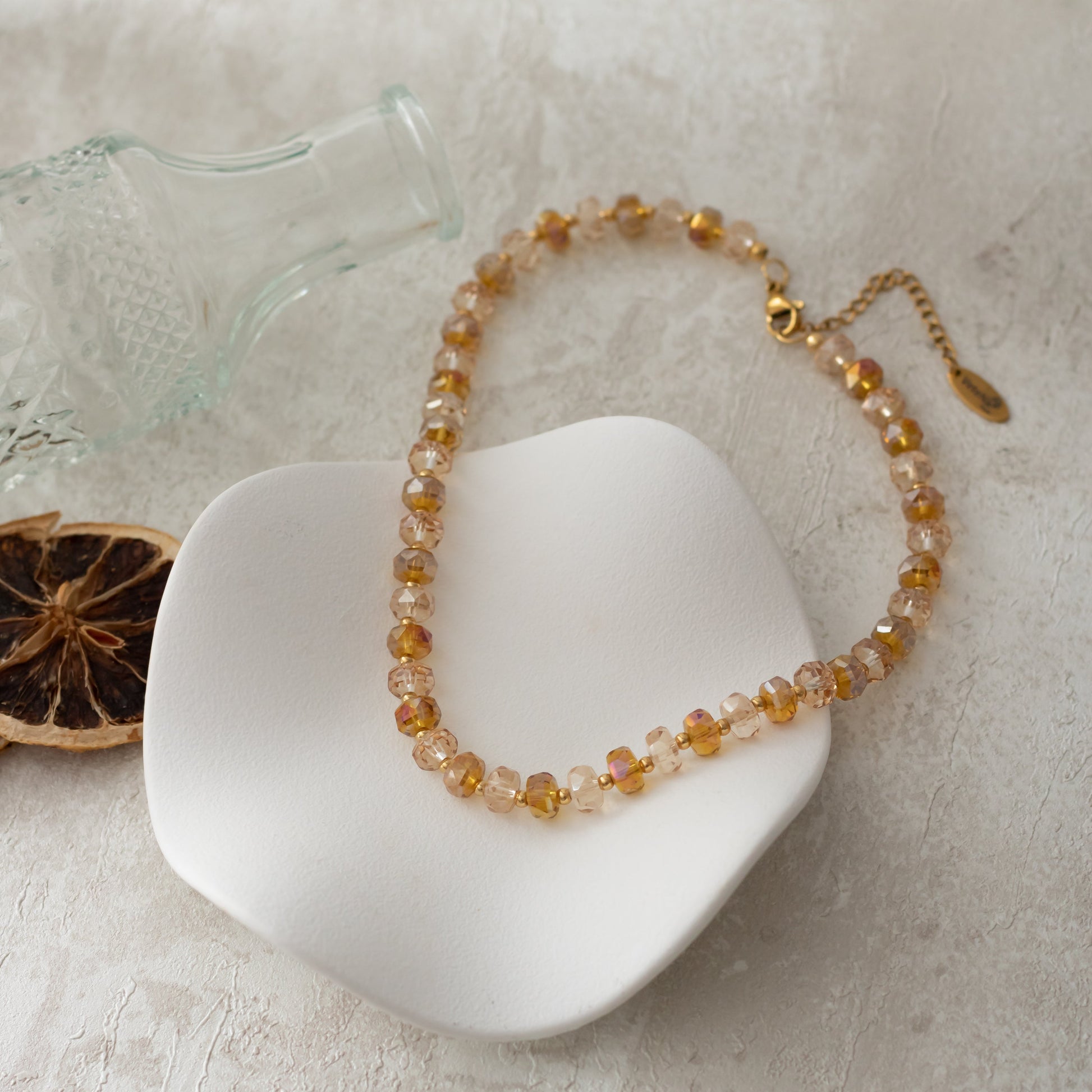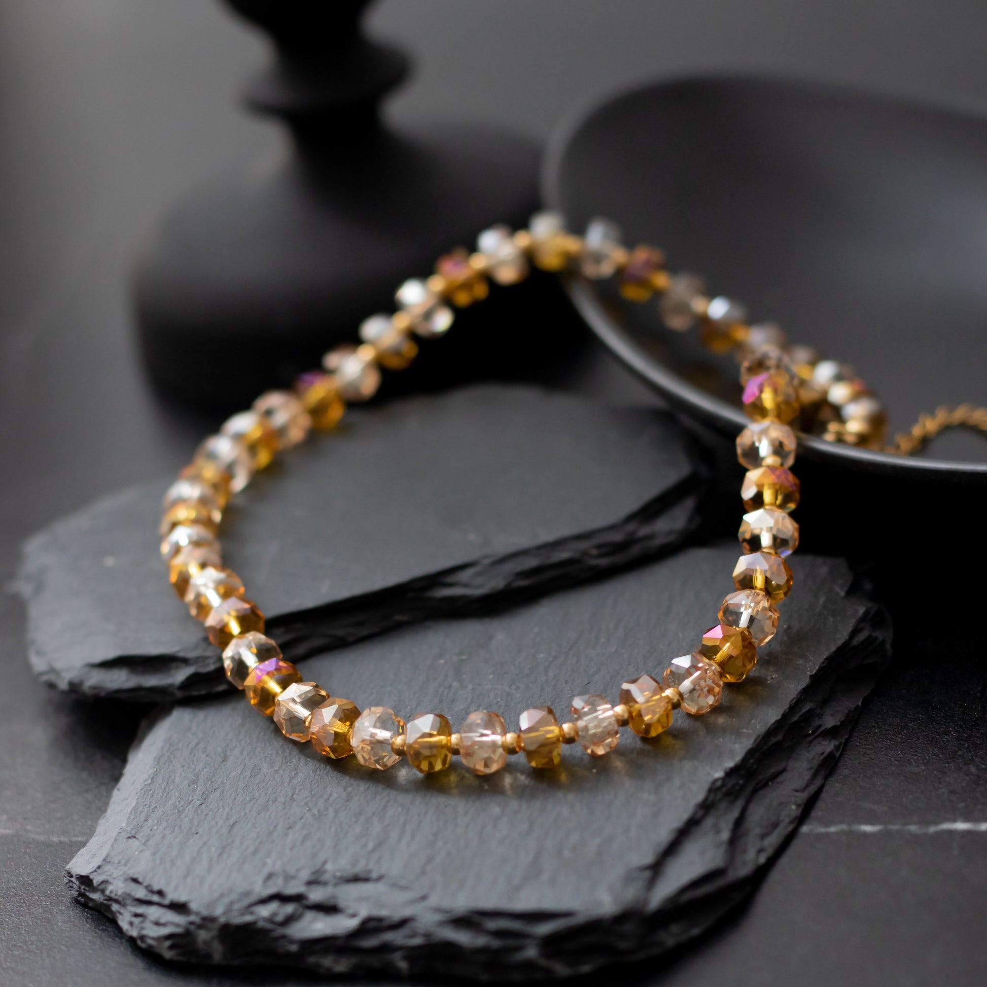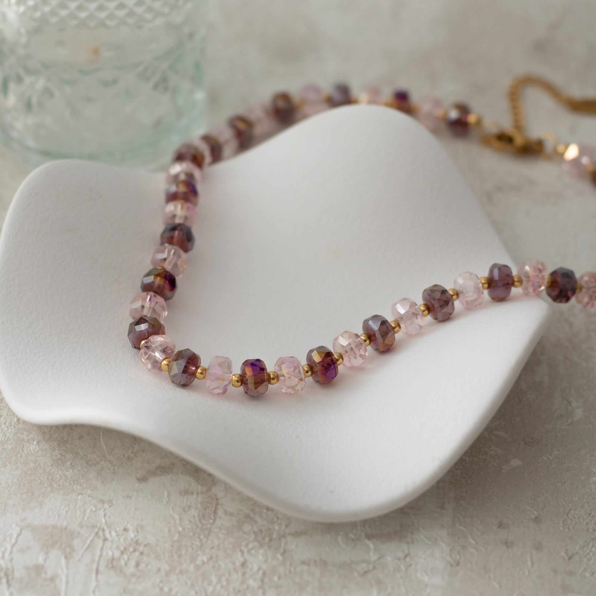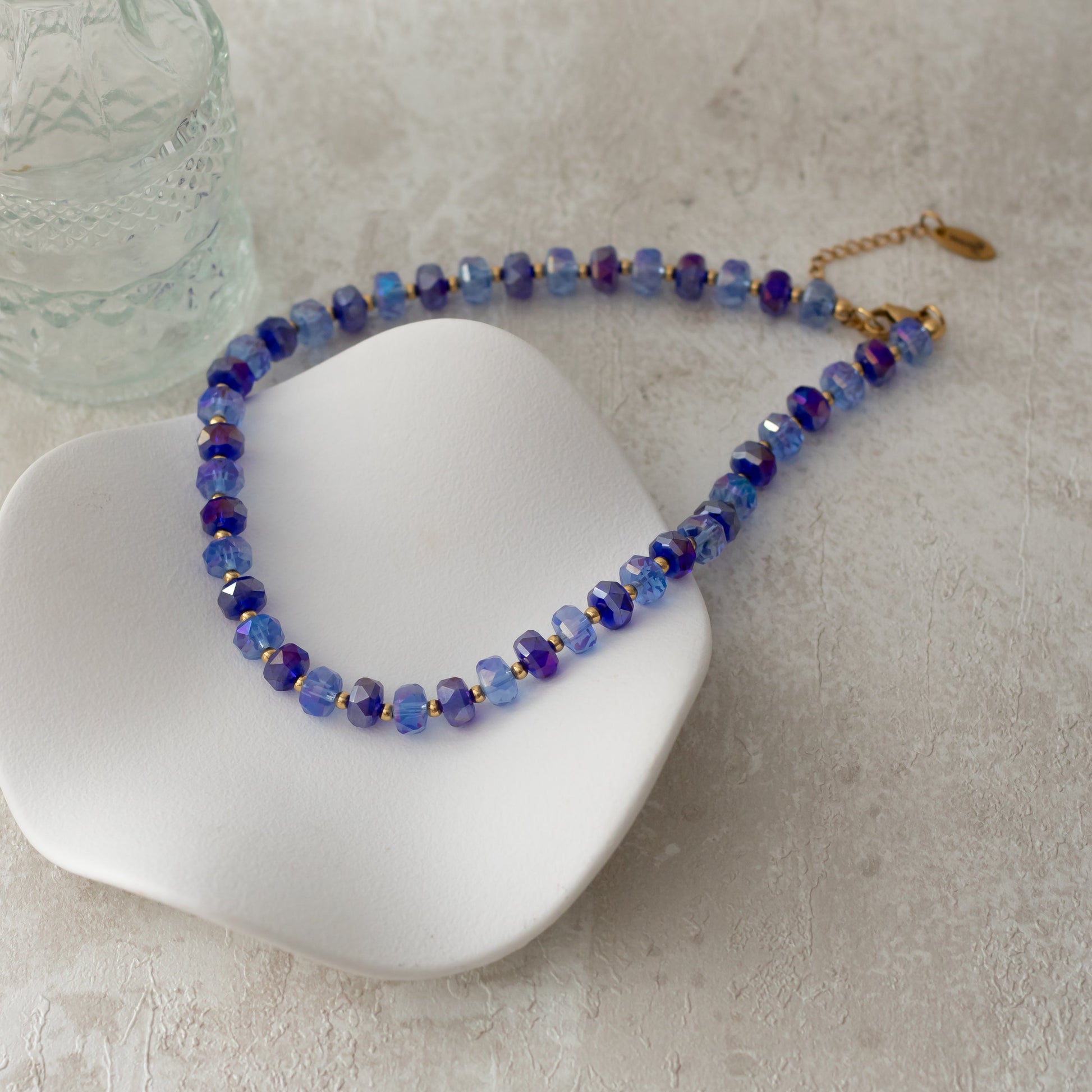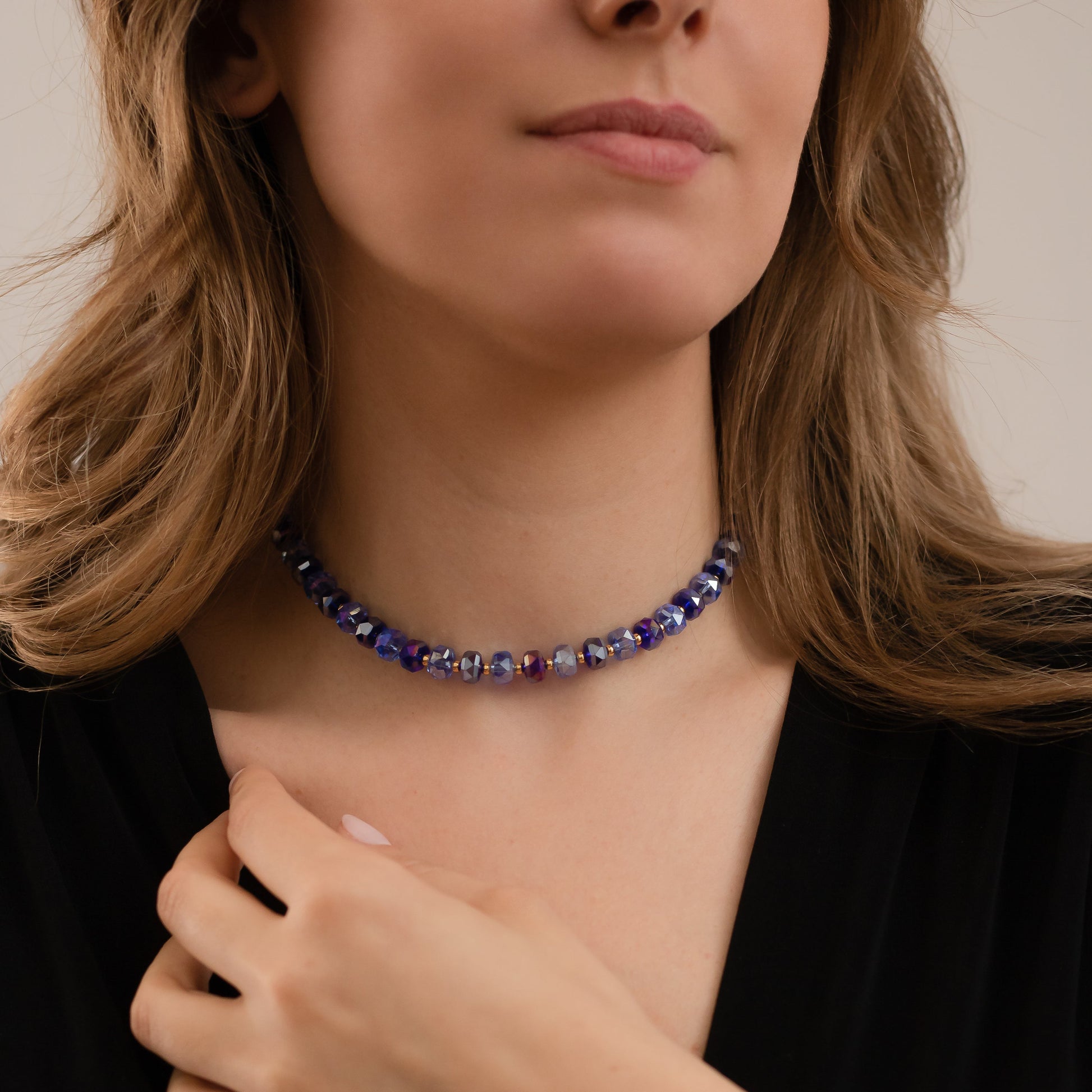 Creada íntegramente con cristales tornasolados, cada uno de sus matices refleja la luz de forma distinta, generando un efecto único en cada movimiento. No hay un solo tono, no hay un solo brillo… hay profundidad, matices y una sensación constante de luz viva que acompaña tu gesto.