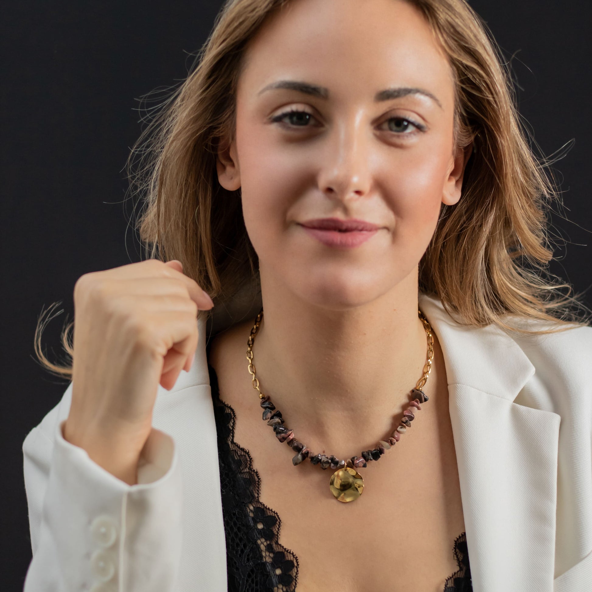 La mitad del collar está compuesta por estas piedras naturales tan favorecedoras, mientras que la otra mitad se forma con una cadena dorada moderna y estilosa. Desde la sección de rodonita desciende un colgante circular martillado, elaborado en acero con baño en oro, que añade textura, brillo y un encanto artesanal que eleva toda la composición con un aire contemporáneo.