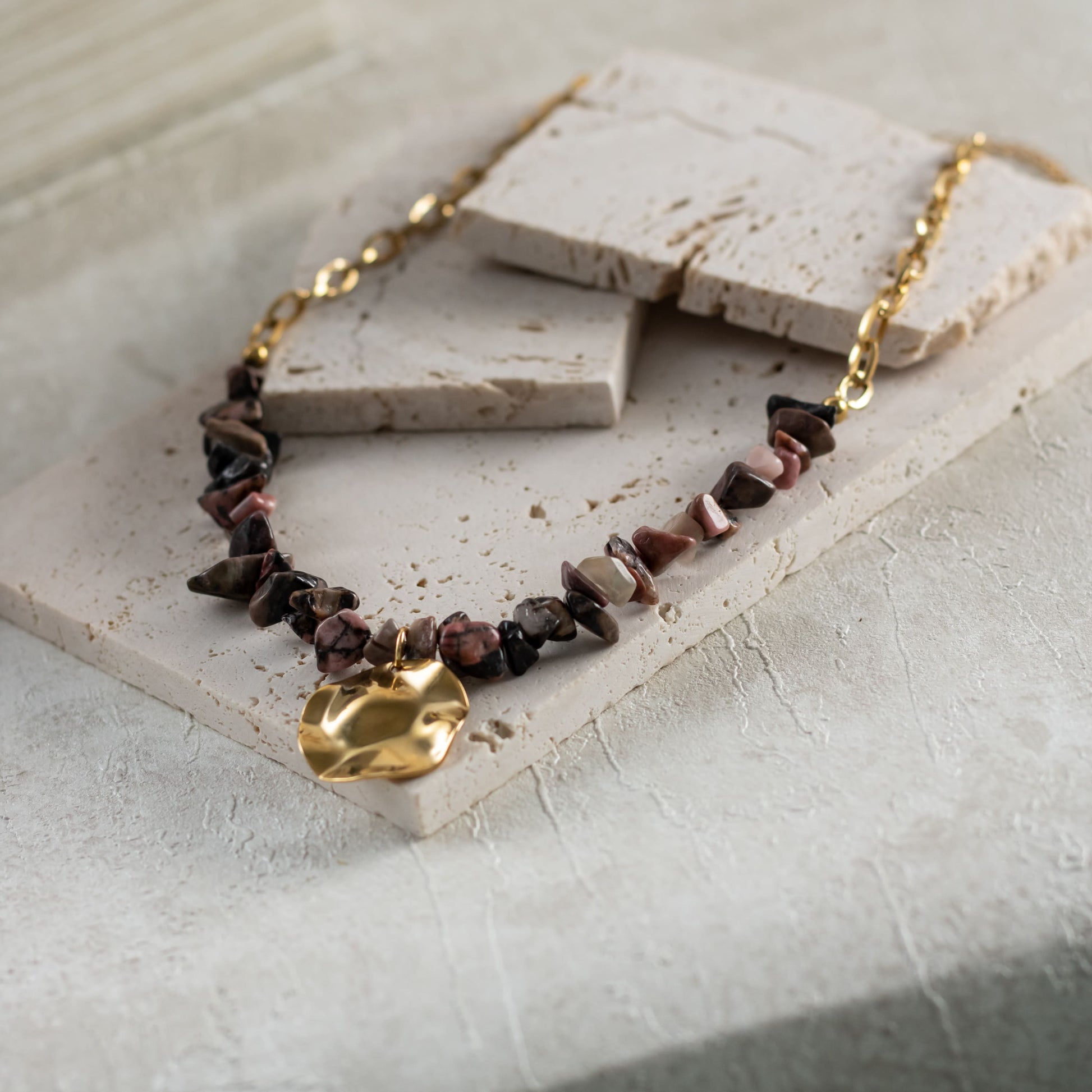 Como un amanecer suave sobre tu piel, este collar combina la calidez de la rodonita con el brillo delicado del dorado.