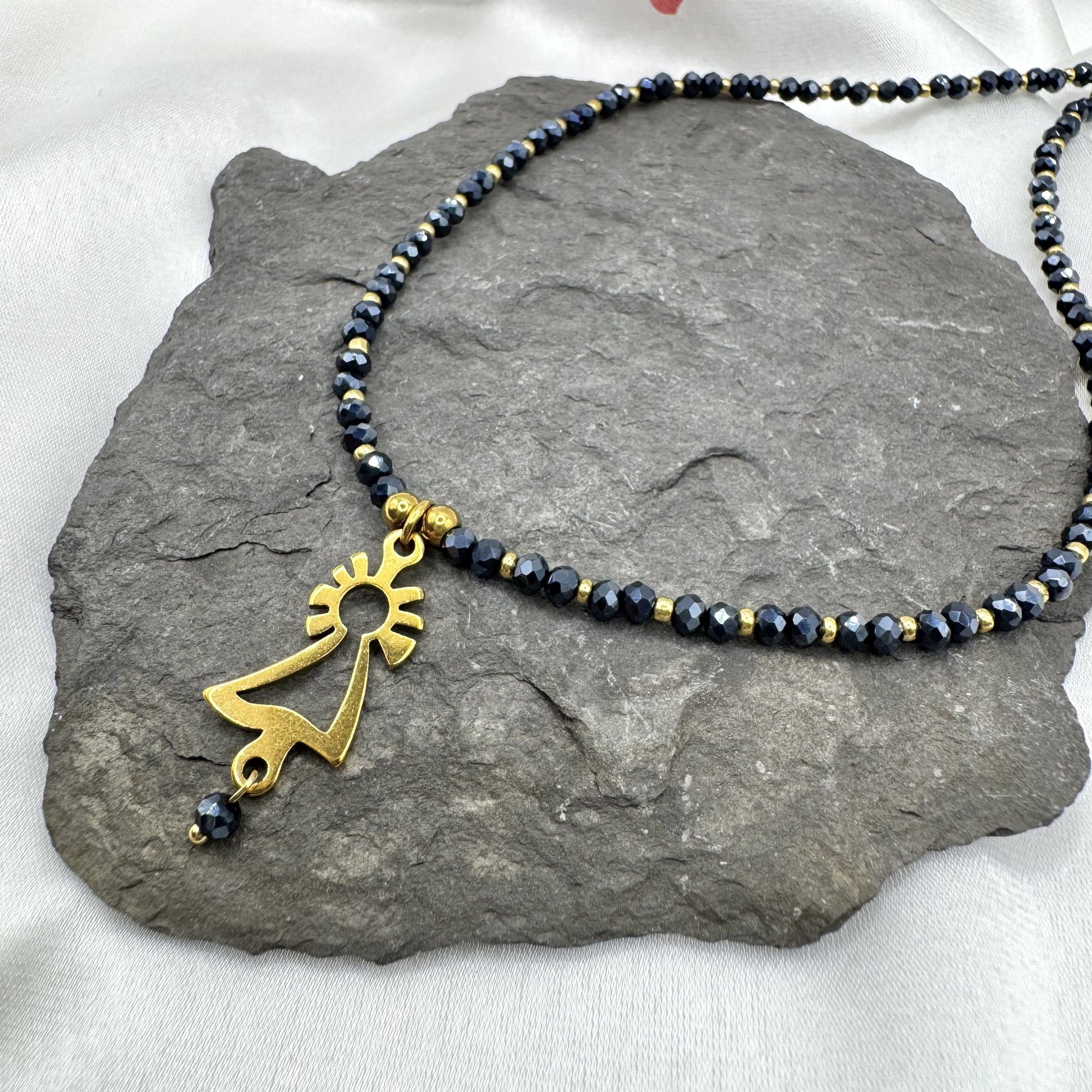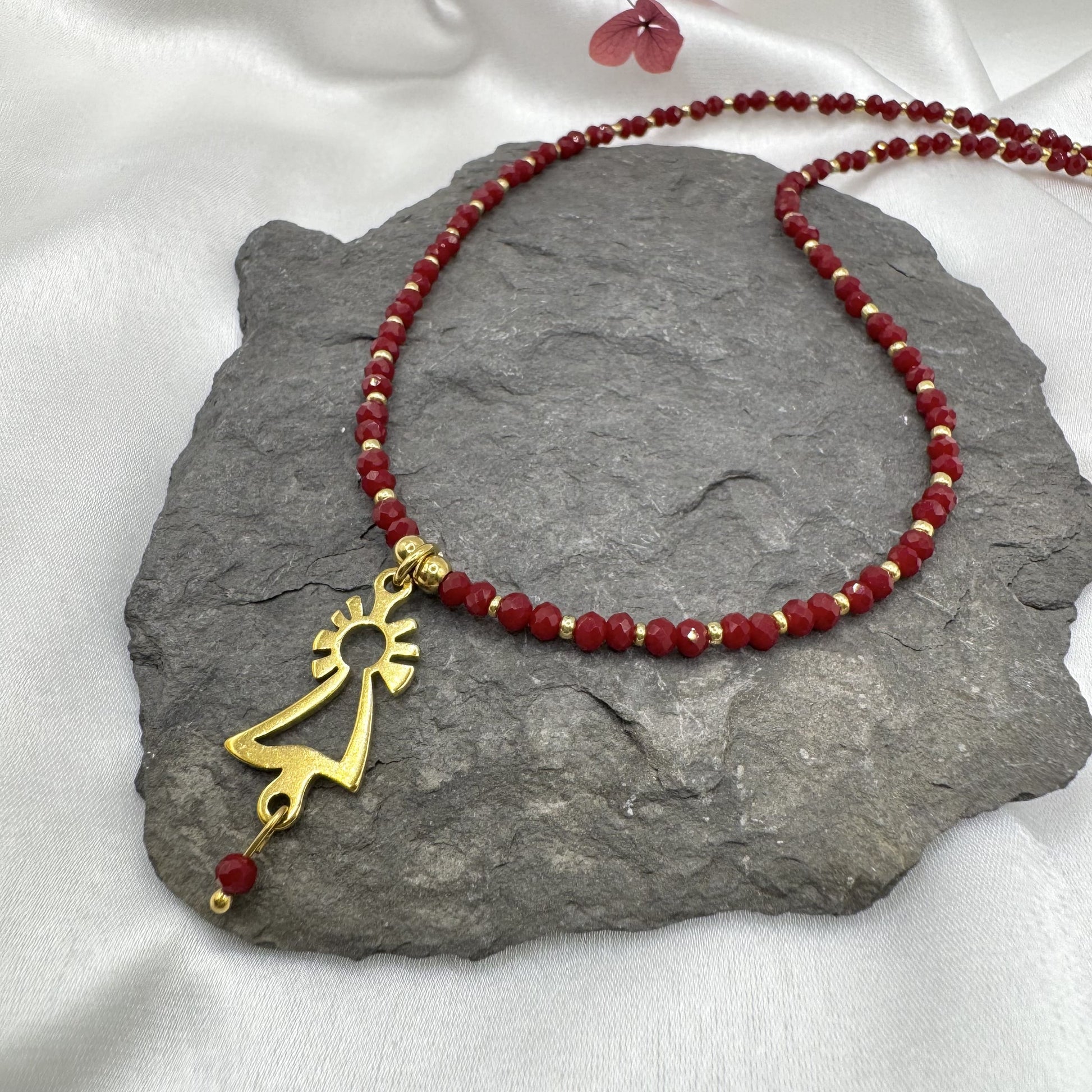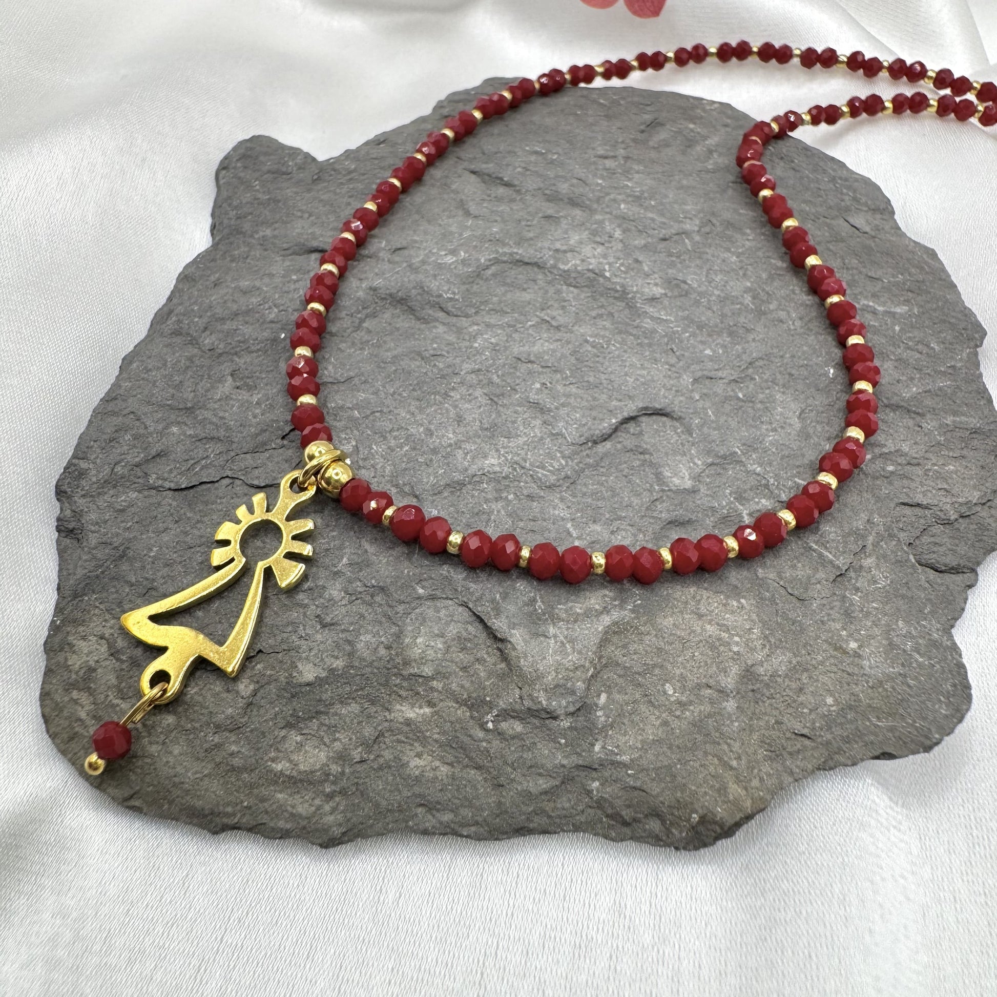 Hecho a mano con delicadas cuentas de cristal y un colgante en acero antialérgico con baño en oro, une tradición, protección y belleza en una joya única.