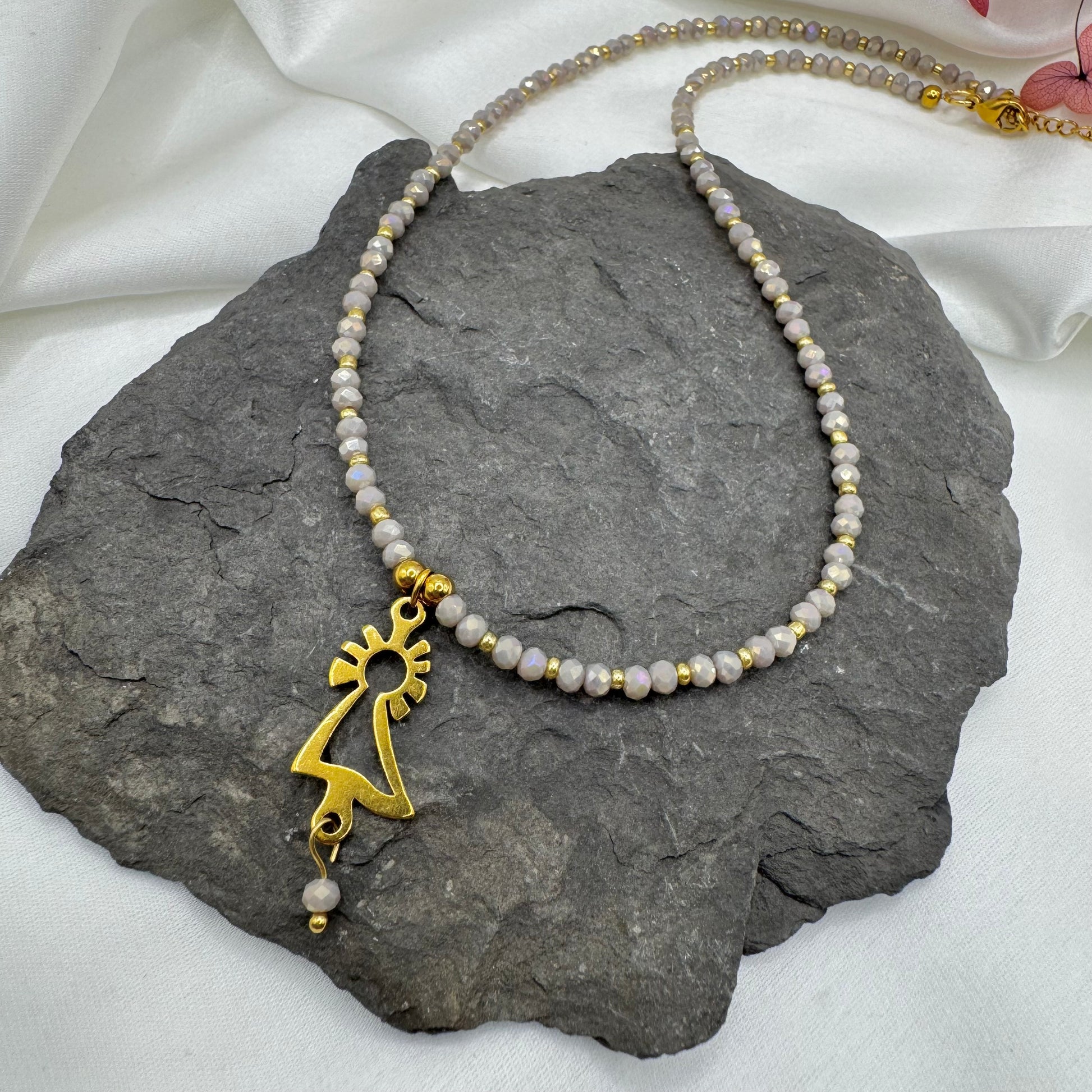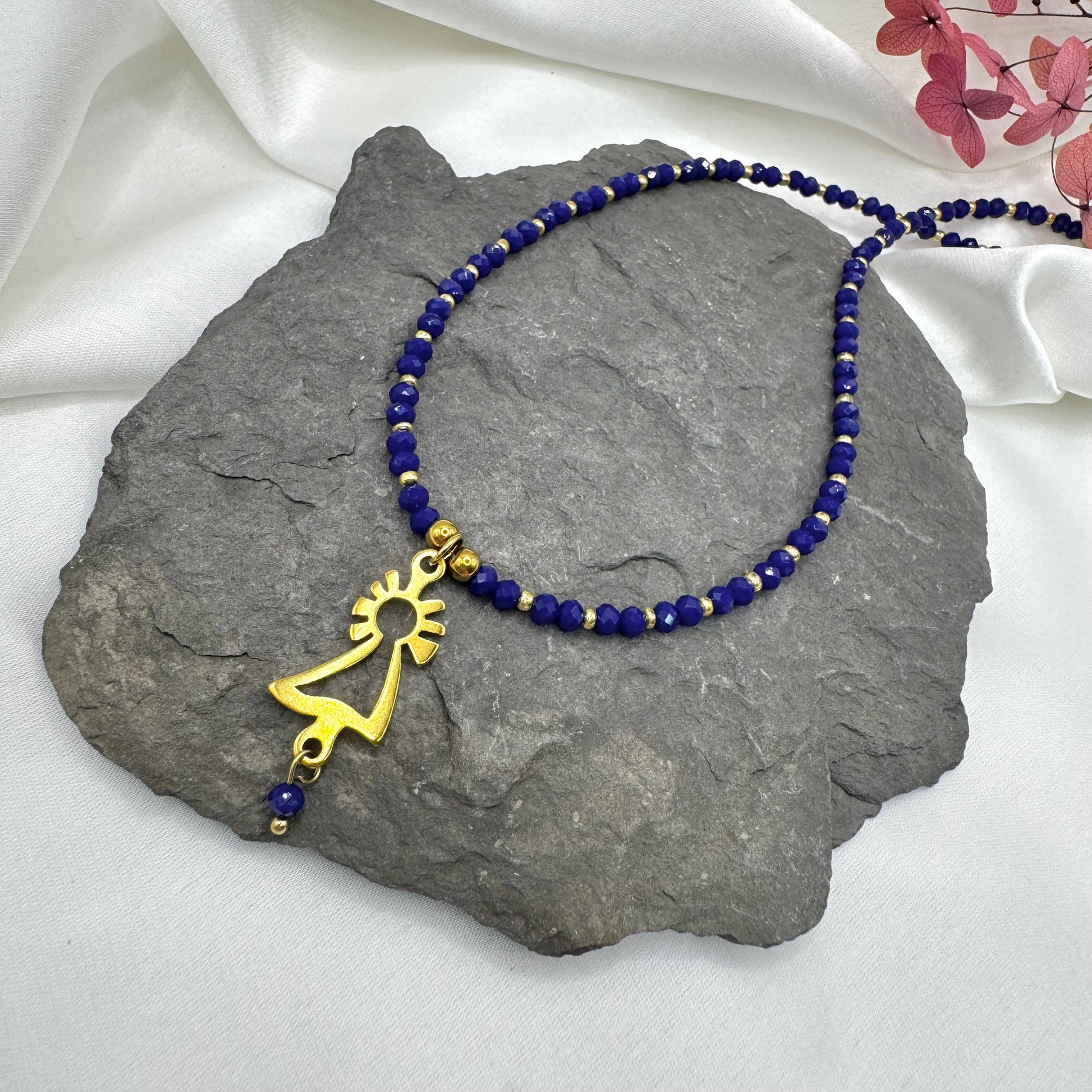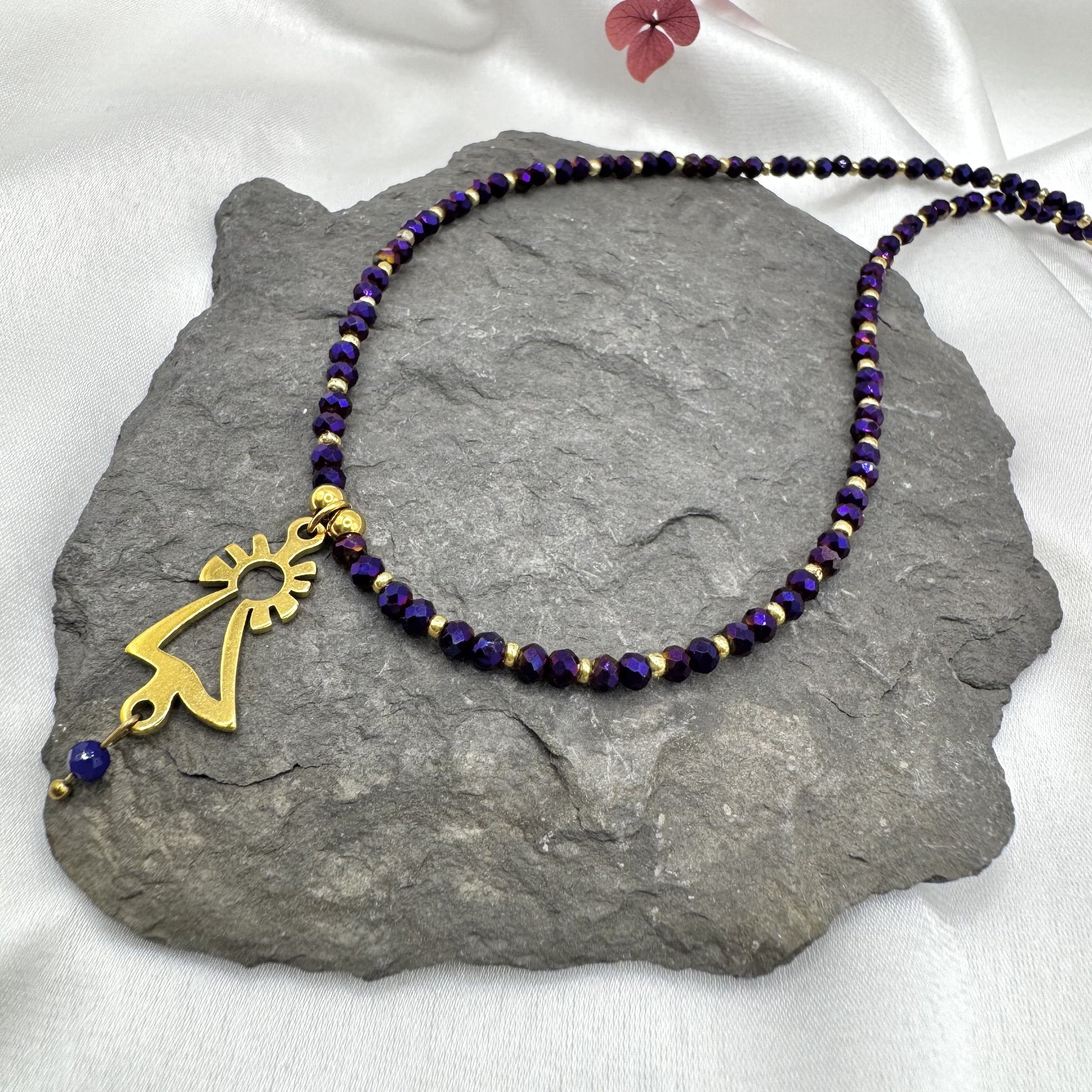 Hecho a mano con delicadas cuentas de cristal y un colgante en acero antialérgico con baño en oro, une tradición, protección y belleza en una joya única.