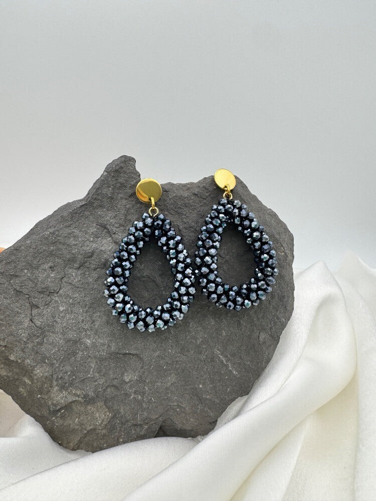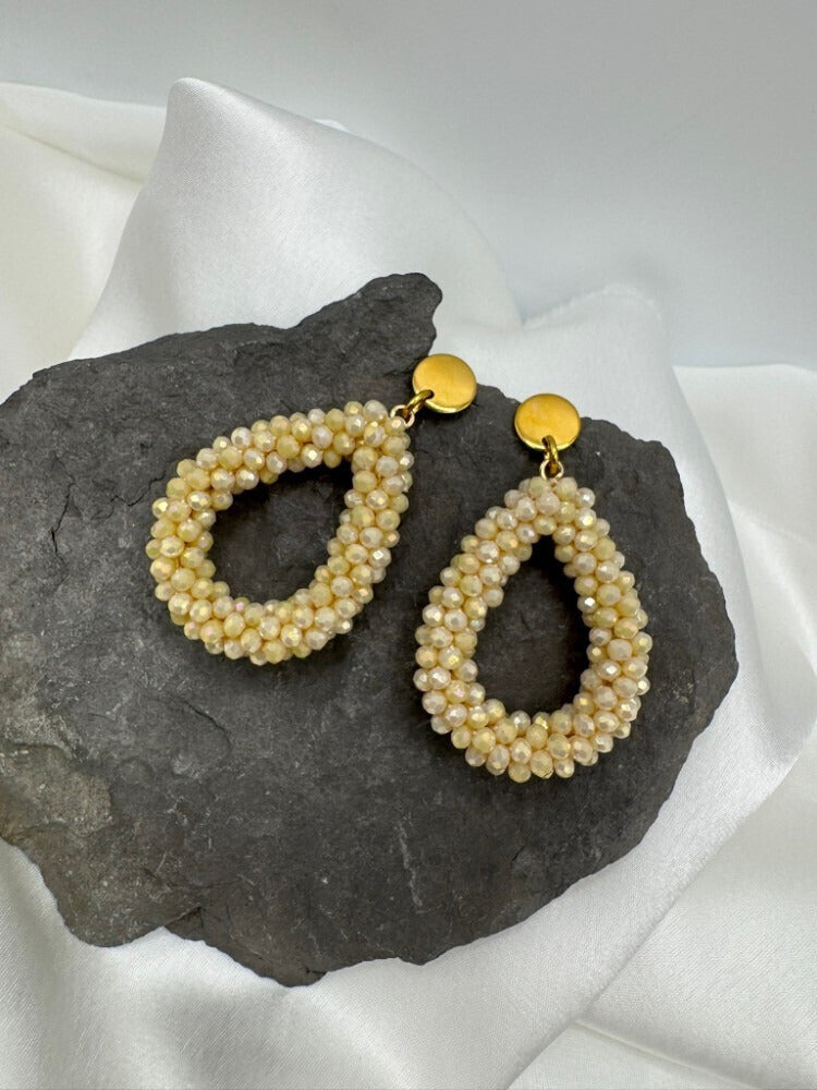 Cristal facetado tejido a mano con acabados de acero hipoalergénico con baño en oro.