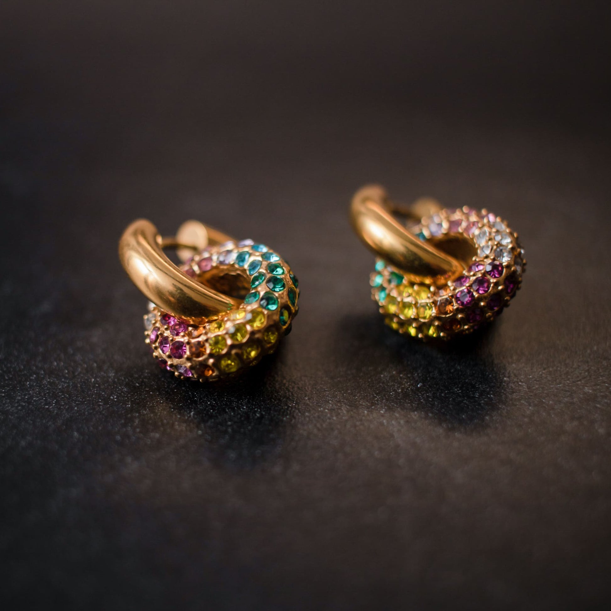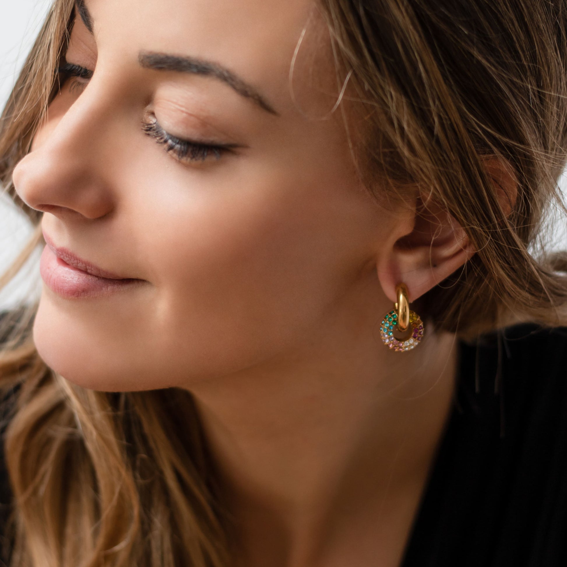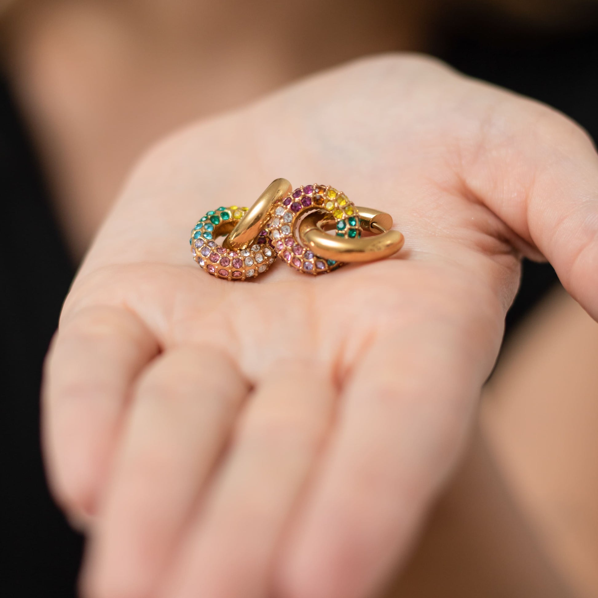 Cubierto de circonitas de colores, el aro colgante crea un arcoíris delicado que ilumina el rostro con cada movimiento.