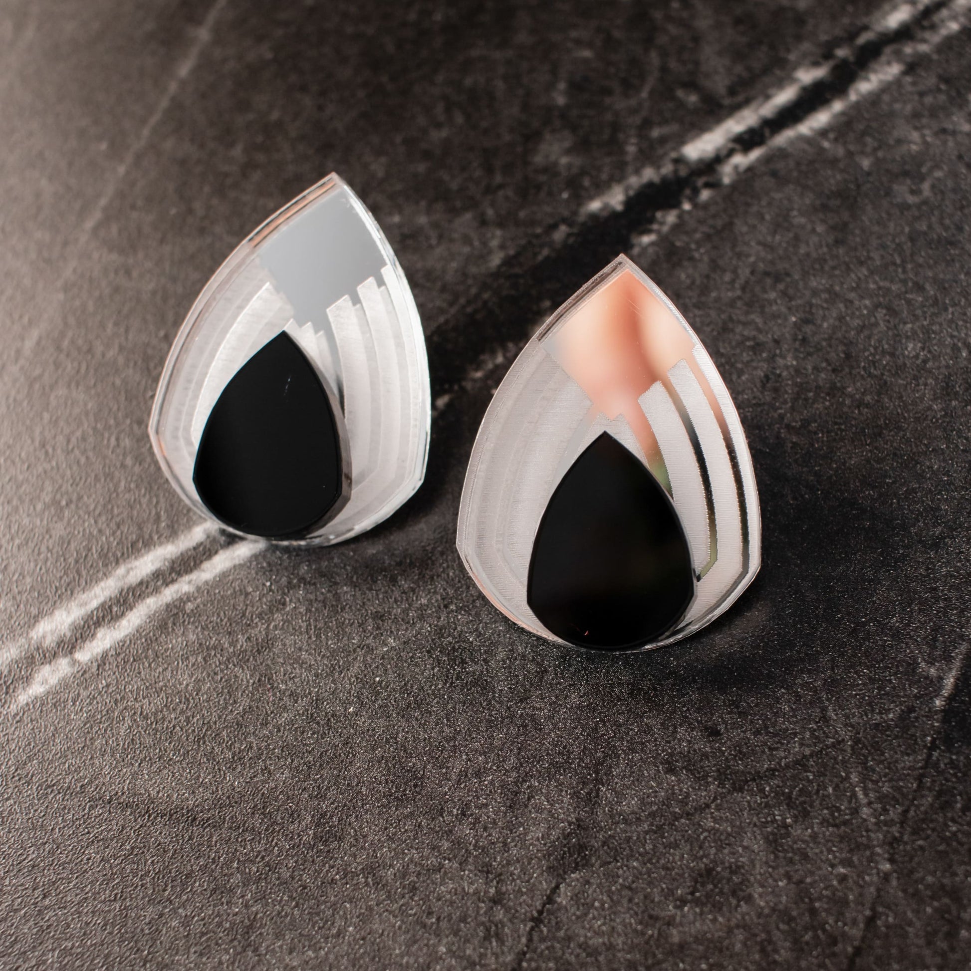 Su diseño en forma de gota irregular aporta un acabado artístico y diferente, mientras que el grabado oscuro en el centro añade profundidad, contraste y un punto de misterio que los hace irresistibles.