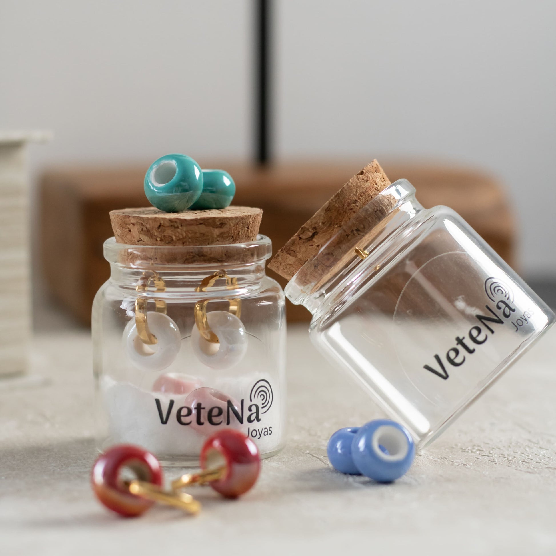 La magia comienza en su presentación: llegan guardados en un bote de cristal, donde encontrarás dos colores de cerámica incluidos en el mismo producto, listos para que puedas cambiarlos según tu look o tu estado de ánimo. Este sistema convierte a Dora en un accesorio altamente versátil, ideal para quienes buscan una joya que se adapte a su ritmo, a su ropa y a cada ocasión.