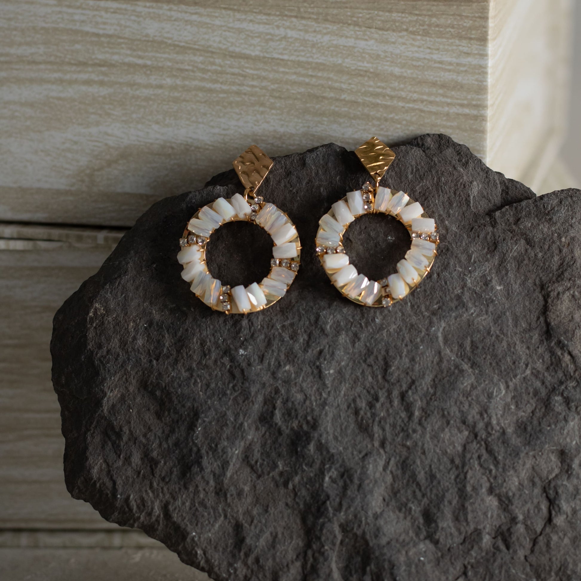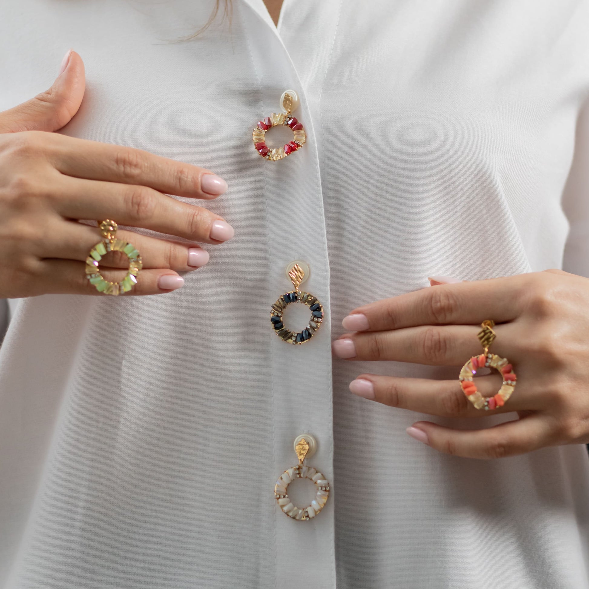 Los pendientes Nessy destacan por su elegancia moderna y su toque artesanal. Su diseño comienza con una base circular abierta, elaborada en acero con baño en oro, que aporta un brillo cálido y duradero. Alrededor de esta estructura, la pedrería colocada como si estuviera “cosida” a mano crea un acabado delicado y sofisticado, lleno de matices y destellos que cambian con la luz.